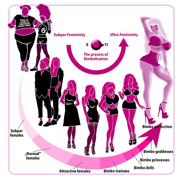 "Bimbofication" is the process of transforming a female into a bimbo. This can be accomplished through training, conditioning, hypnosis, reprogramming, even positive messaging. Anything that encourages a woman to strive for bimbo behavior, bimbo appearance, and bimbo posture. The three Bimbo Pillars. Or "really big rods!"